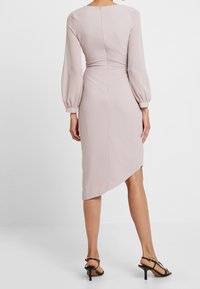 Robe rose pâle à manches longues, décolleté en V et détail frontal tordu. Ourlet asymétrique ; tissu fluide avec une texture douce. Talons noirs à lanières.
