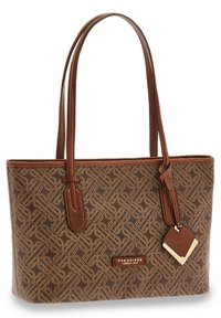 Sac fourre-tout en tissu marron à motifs avec des accents en cuir, doté de deux longues poignées et d'une étiquette décorative. Forme rectangulaire avec une fermeture éclair en haut.