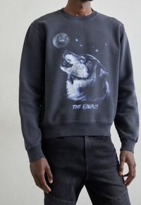 Personne portant un sweat-shirt foncé avec un motif de loup hurlant, lune et étoiles, et le texte "THE KOOPLES" sur le devant.