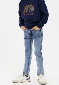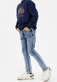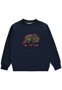 Sweat-shirt navy avec un graphique de tigre, associé à un jean en denim bleu clair déchiré et des baskets blanches avec des accents navy.