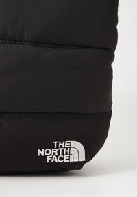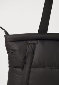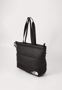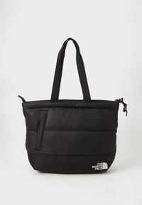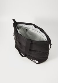 Sac fourre-tout noir rembourré avec deux poignées, fermeture éclair sur le dessus, poche latérale et logo The North Face blanc en bas à droite.
