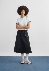 Personne portant une jupe noire mi-longue avec le logo The North Face, des chaussettes blanches montantes et des chaussures de sport rose clair, debout sur un tapis bleu.