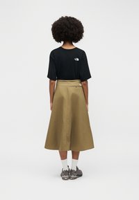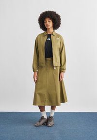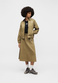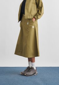 Personne portant une jupe North Face vert olive, une veste assortie, des chaussettes blanches et des chaussures de randonnée grises, debout sur un tapis bleu.