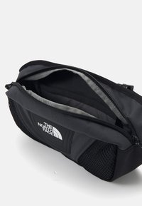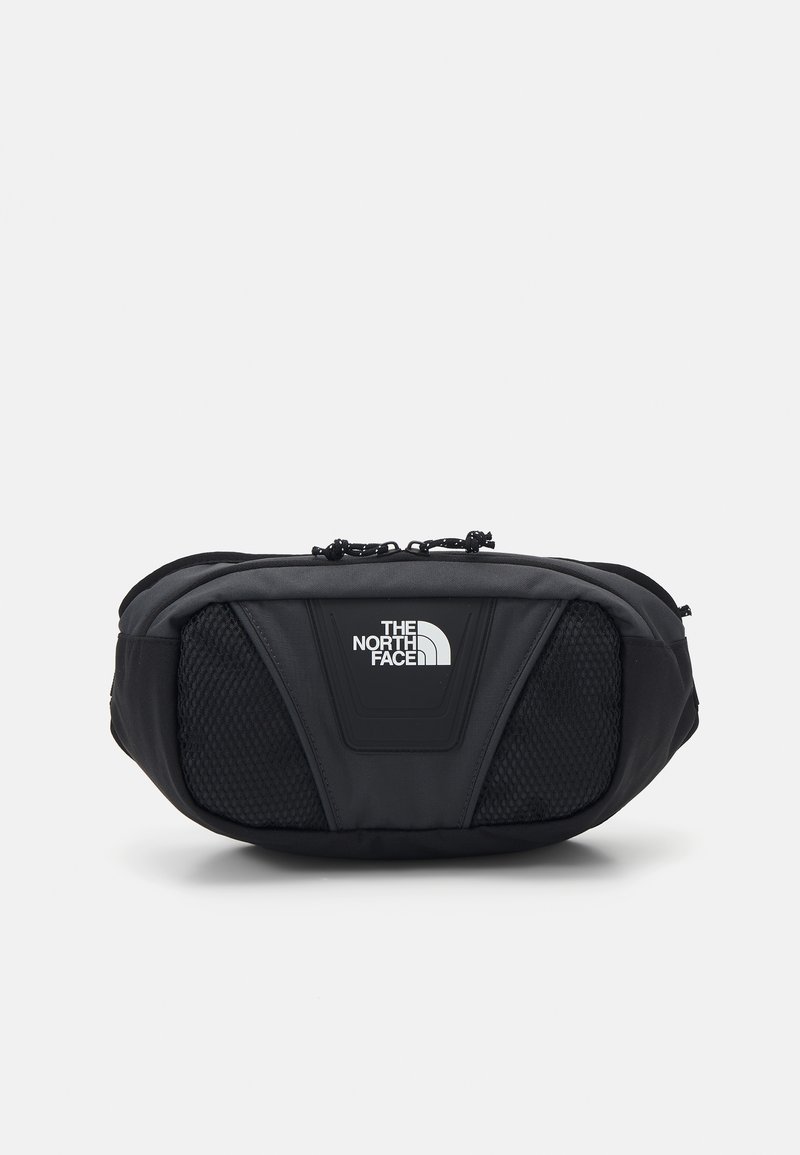 Sac banane noir de The North Face avec compartiments zippés et panneaux latéraux en maille, présenté sur un fond gris clair uni.