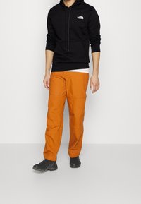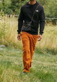 Sweat à capuche noir avec poche avant et logo, en tissu doux. Associé à un pantalon orange dans un cadre naturel en plein air.