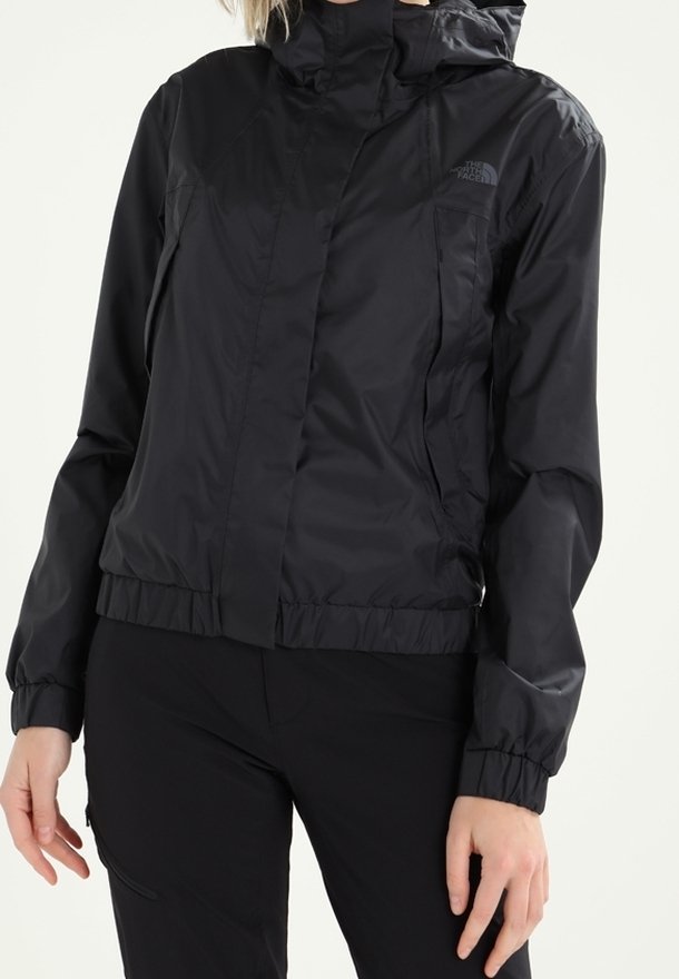 Veste légère noire avec capuche, fermeture éclair à l'avant, poignets et ourlet élastiques, présentant un logo de marque discret sur la poitrine et un design élégant.