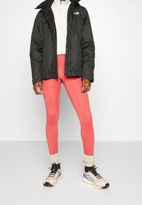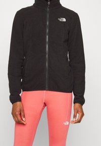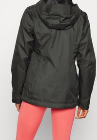 Veste imperméable noire avec fermeture éclair sur le devant, capuche et poignets ajustables. Comprend la technologie "DryVent" et un logo sur la poitrine.
