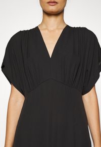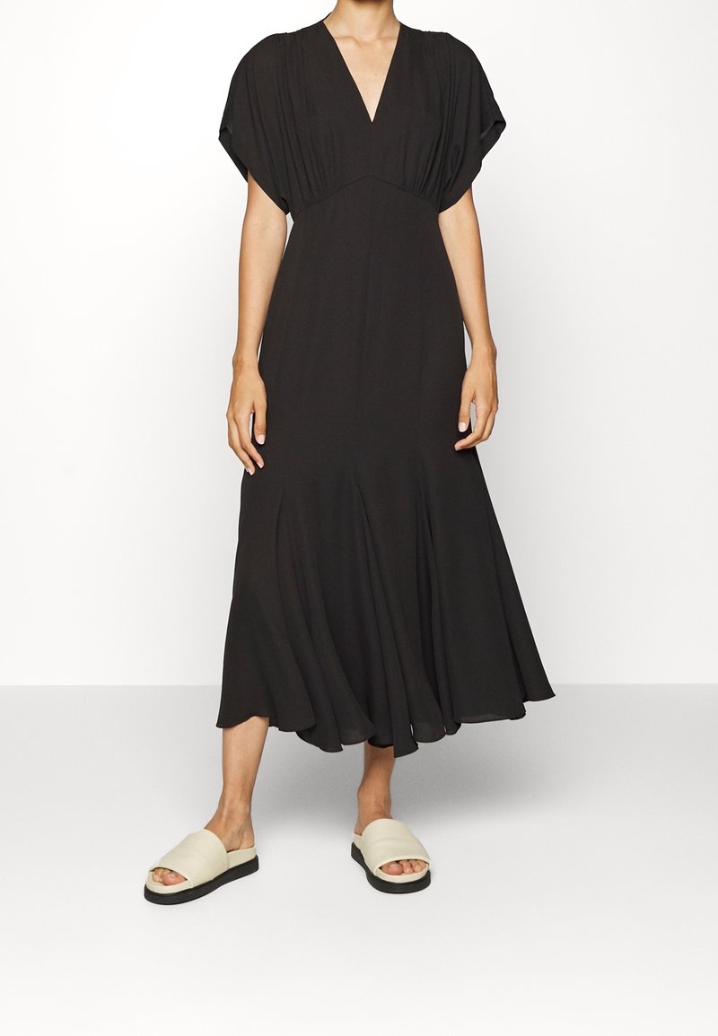 Robe midi noire fluide avec de courtes manches chauve-souris et un décolleté en V. Tissu doux avec un ourlet évasé. Assortie à des sandales faisant glisser crèmes.