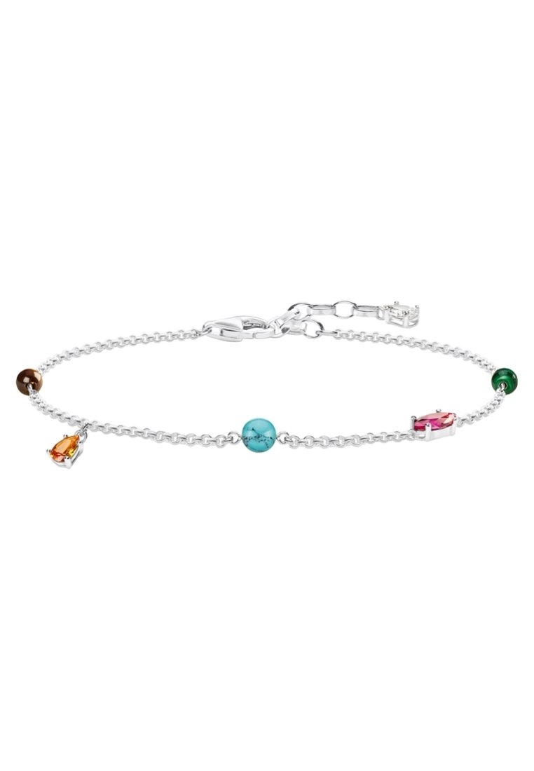 Bracelet chaîne en argent avec quatre pierres précieuses colorées : marron, goutte orange, rond turquoise et rectangle rose.