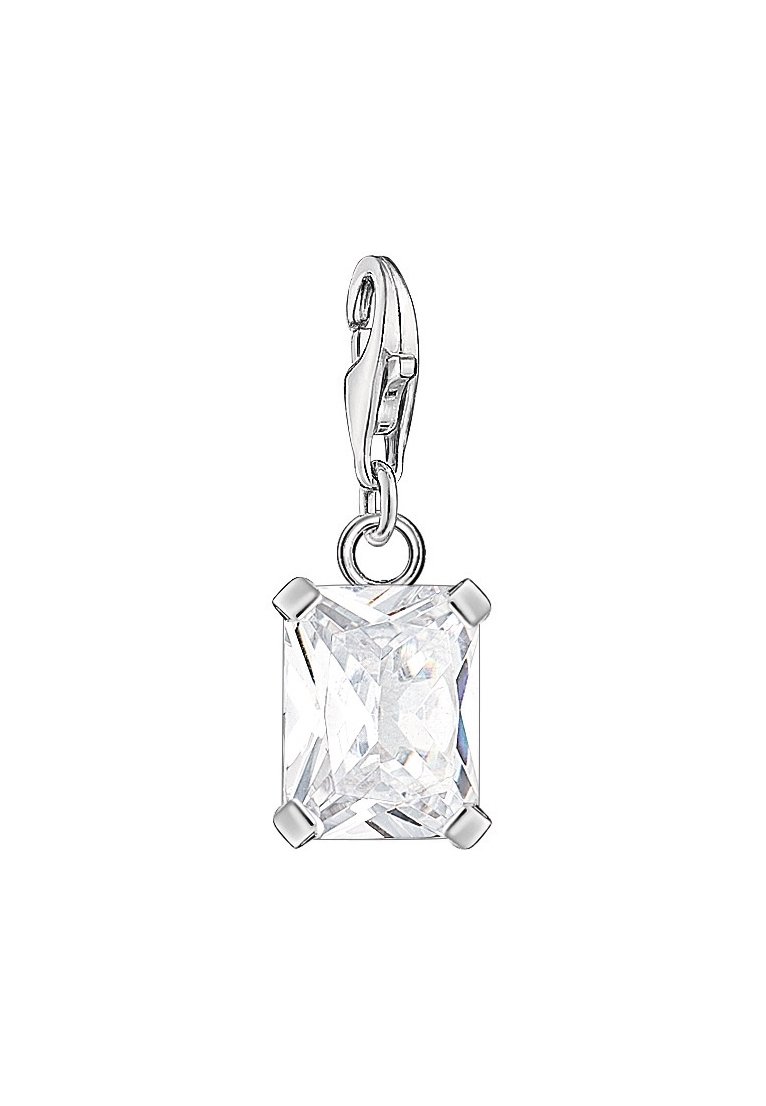Pendentif en pierre précieuse rectangulaire transparente avec montage à griffes en argent et fermoir homard pour attacher à un collier ou un bracelet.