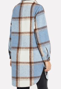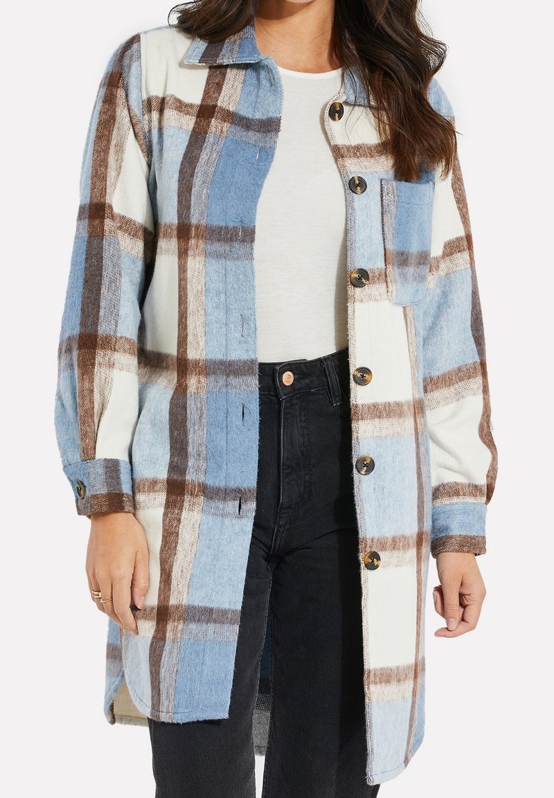Veste à boutons à carreaux en bleu, marron et crème. Fabriquée en tissu texturé avec un col et une poche poitrine. Manches longues.