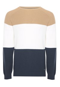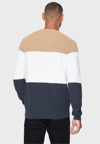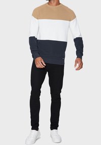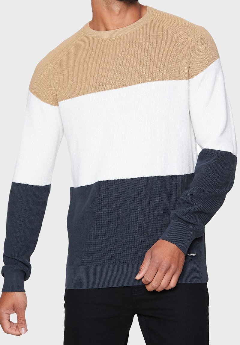Homme portant un pull à manches longues en maille avec des blocs de couleurs beige, blanc et gris foncé, associé à un pantalon noir.