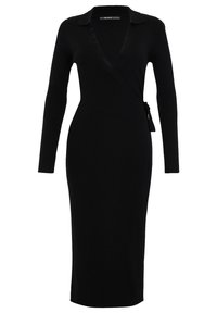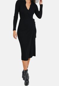 Robe noire à côtes avec manches longues, décolleté en V, longueur mi-mollet et détail de taille nouée, associée à des bottines noires.
