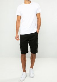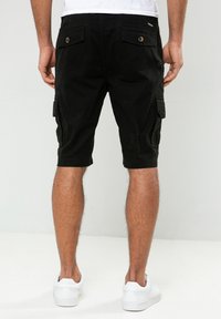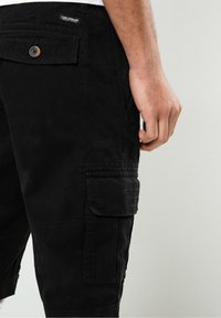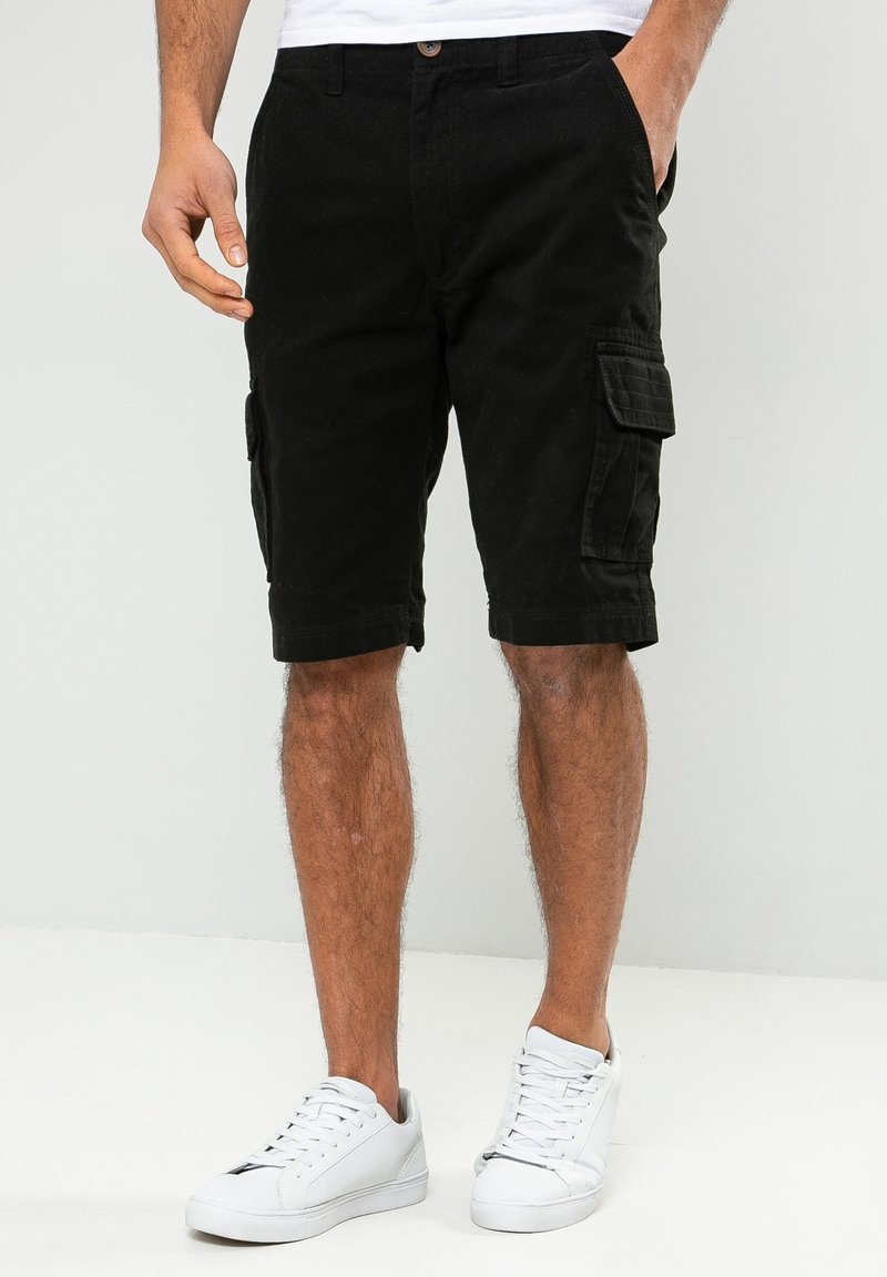 Shorts cargo noirs avec une coupe classique, fabriqués en tissu de coton durable. Présentent des poches latérales et une texture légèrement décolorée.