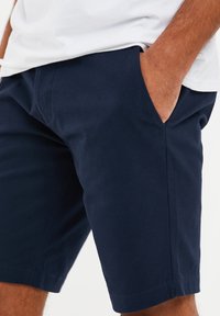 Homme portant un short bleu marine, des baskets blanches et une chemise blanche, avec une main dans la poche, se tenant sur un fond blanc.
