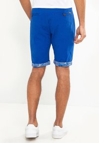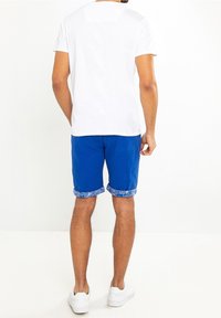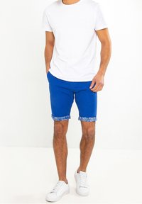 Un homme portant un short bleu vif avec des revers à motifs et des baskets blanches, debout devant un fond blanc uni.