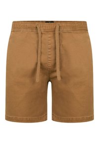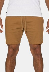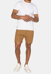 Shorts en coton marron avec une taille élastique et un cordon de serrage, des poches latérales et une coupe décontractée, associés à des baskets blanches.