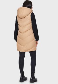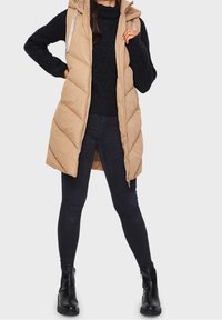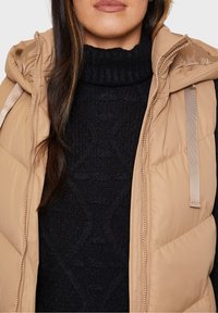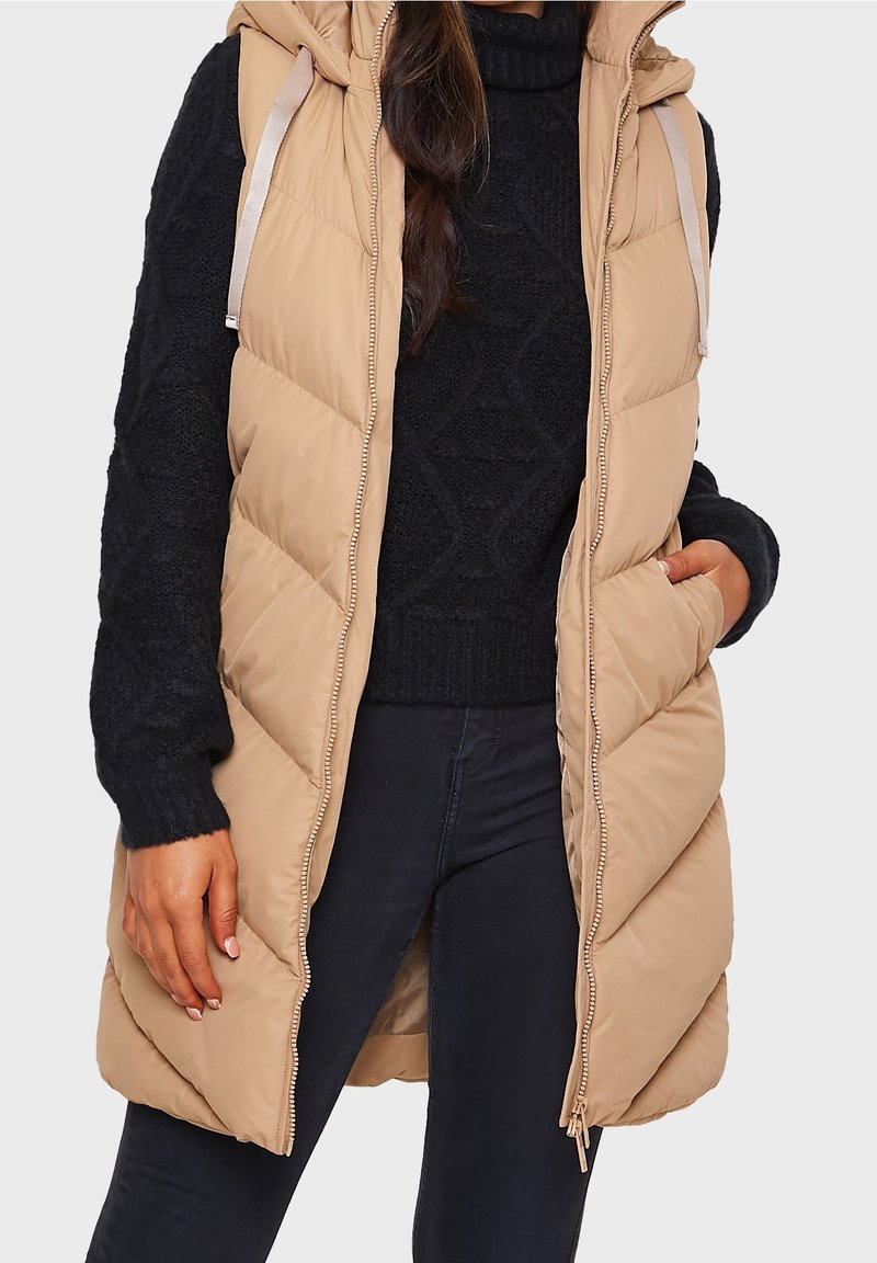 Femme portant un manteau matelassé beige sans manches avec capuche, un pull texturé noir et un pantalon noir, une main dans la poche et l'autre détendue.
