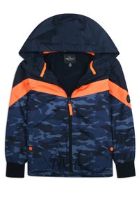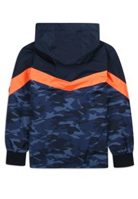 Veste à motif camouflage bleu marine avec une bande orange, une capuche, une fermeture éclair et des poches. Fabriquée en matériau léger avec des poignets et un ourlet élastiques.