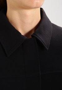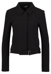 Veste noire courte avec boutons sur le devant et deux poches avant, portée par-dessus une chemise bleu clair à col, associée à un jean bleu clair.