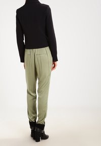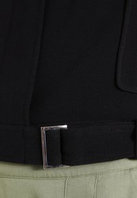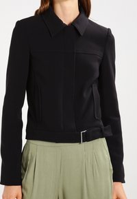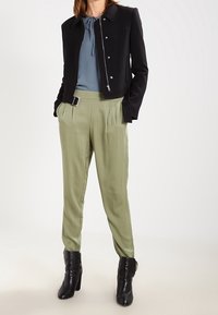 Veste noire cintrée avec col, poches avant et détail boucle, associée à un pantalon plissé taille haute vert clair.
