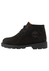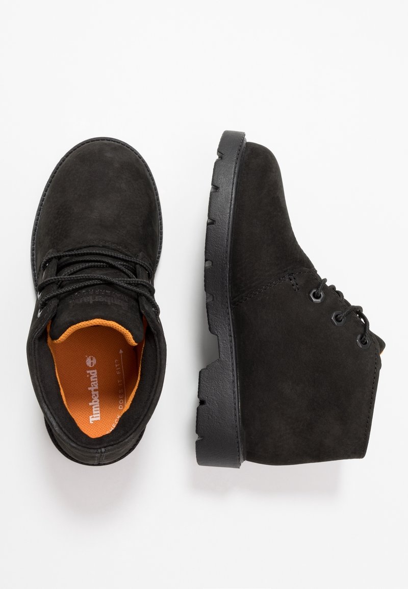 Bottines en daim noir avec semelles en caoutchouc noir. Dotées de semelles intérieures orange et de lacets noirs. Conception à bout arrondi avec deux œillets pour les lacets.