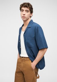 Homme portant un short marron jusqu'aux genoux, des chaussettes blanches, des bottes de travail couleur beige, une chemise blanche et une chemise bleue à manches courtes déboutonnée.