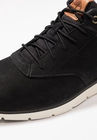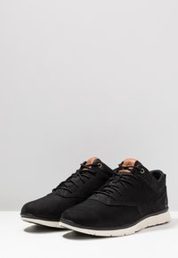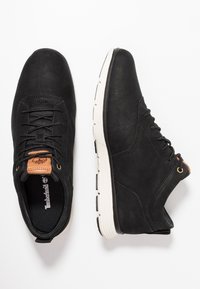 Baskets en cuir noir avec une tige texturée, un design à lacets, des œillets dorés et une semelle blanche contrastante. Présentent un logo au talon.