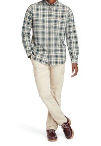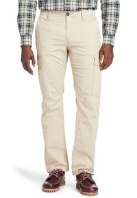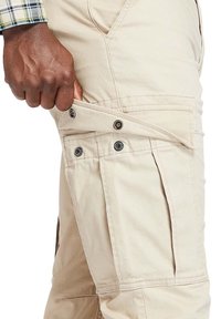 Pantalon cargo beige avec poches latérales, coupe droite, coutures contrastantes et tissu en coton résistant. Porté avec des baskets de couleur claire.