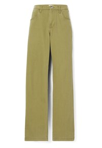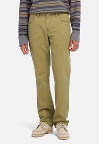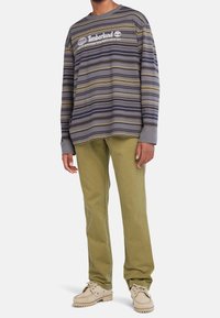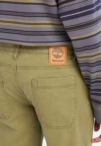 Pantalon en coton vert olive à coupe droite, poches avant et fermeture à boutons, associé à des mocassins bateau beige clair. Haut à rayures horizontales.