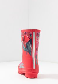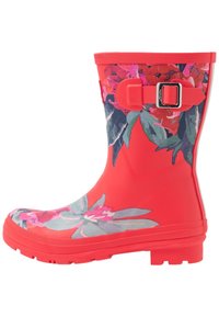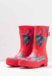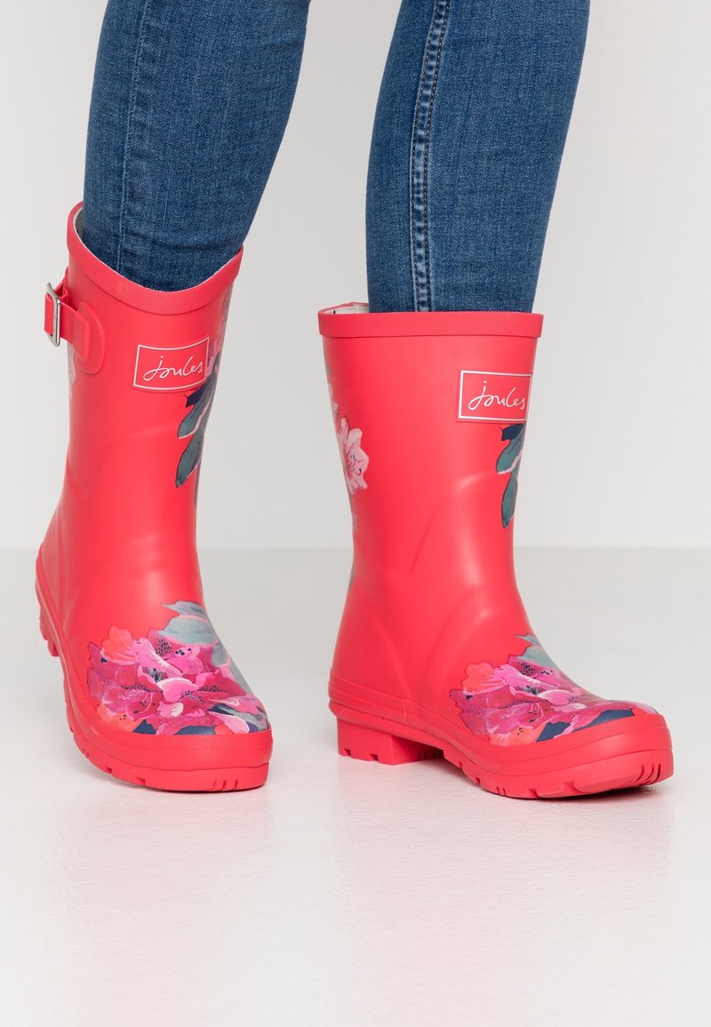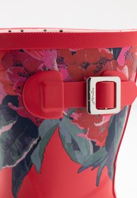 Bottes de pluie en caoutchouc rouge avec des motifs floraux en rose et vert, dotées d'une boucle décorative et d'une semelle texturée antidérapante.