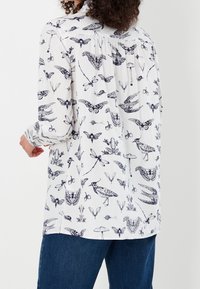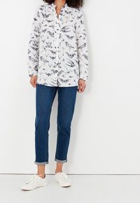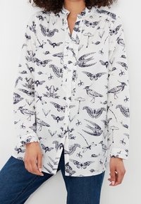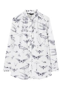 Blouse blanche à manches longues avec imprimé nature noir comprenant des oiseaux, papillons, grenouilles, champignons et libellules, portée avec un jean bleu.