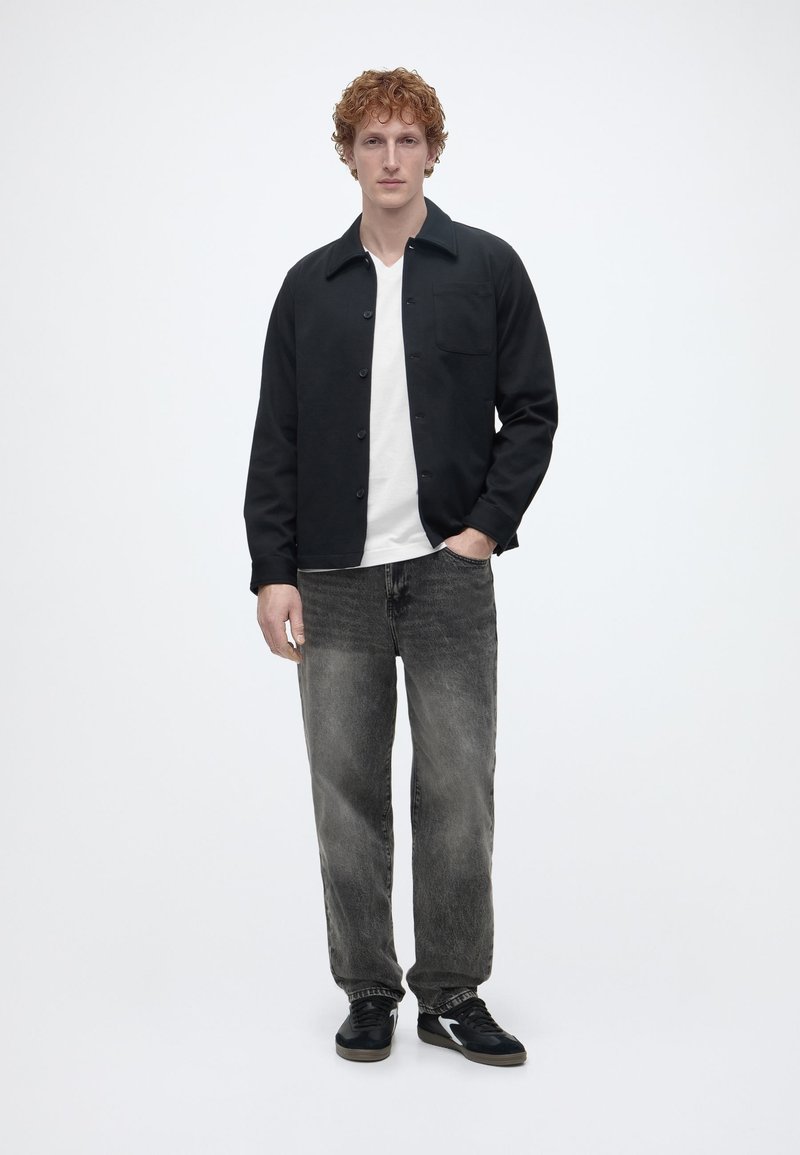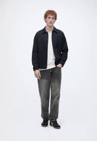 Jeune homme aux cheveux bouclés portant une veste noire boutonnée, un t-shirt blanc, un jean noir délavé et des baskets noires, debout avec une main dans la poche.
