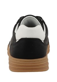 Baskets basses noir et blanc avec semelle marron, fermeture à lacets sur le devant, et logo "Tom Tailor" sur le panneau latéral et la semelle.