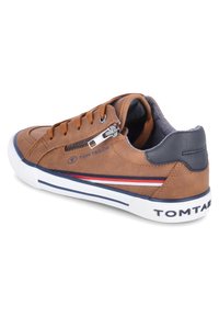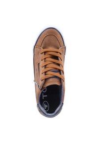 B baskets en cuir brun avec un design à lacets, semelles blanches, accents bleu marine et un détail de zip sur le côté. Finition texturée et intérieur rembourré.