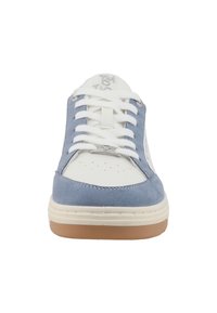 Baskets blanches et bleu clair avec une tige en suède et cuir, bout rond, fermeture à lacets sur le devant, et semelle en caoutchouc avec un motif de traction marron.