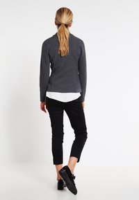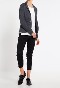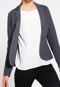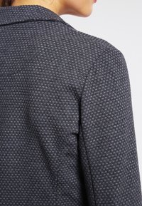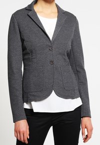 Veste grise texturée en tissu tissé, dotée d'un col cranté, de deux boutons et de poches avant, conçue avec une silhouette cintrée.
