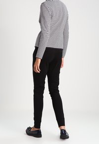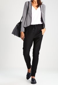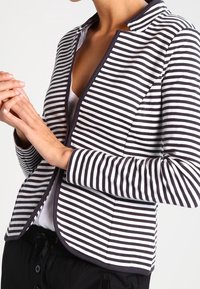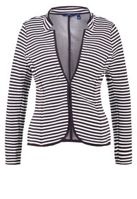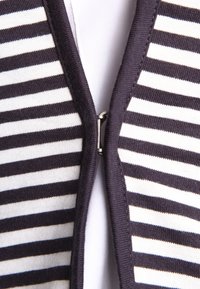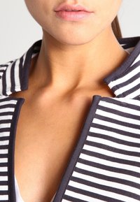 Veste rayée en bleu marine et blanc, avec un col montant et des manches longues. Le tissu est lisse avec une bordure contrastée le long des bords.