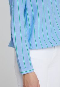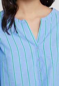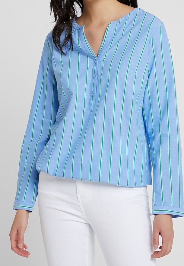Blouse bleu clair à manches longues avec des rayures verticales vertes et blanches, col boutonné, portée avec un pantalon blanc.