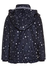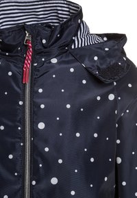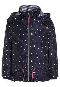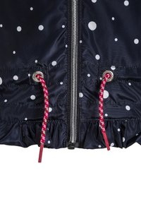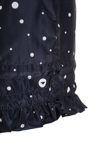 Imperméable pour enfants bleu marine à pois blancs, avec col intérieur rayé, fermeture éclair avant, cordons à embouts rouges et ourlet à volants.