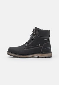 Bottine noire à lacets avec col rembourré, surpiqûres contrastées, semelle en caoutchouc et logo "Tom Tailor" sur le côté du talon.