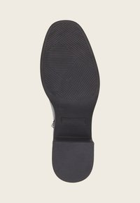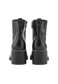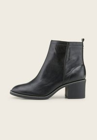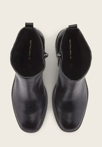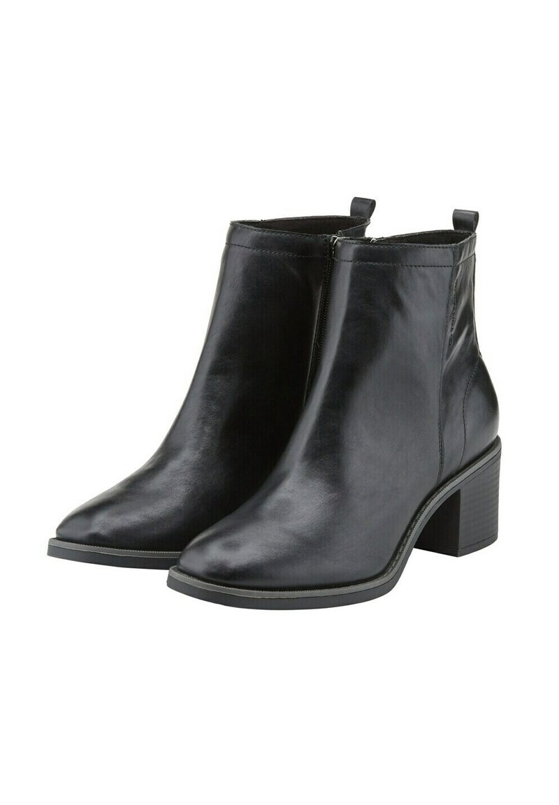 Bottines en cuir noir à finition lisse, bout arrondi, petit talon carré et languette arrière ; fermeture éclair latérale ; design minimaliste.