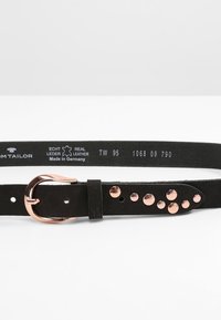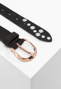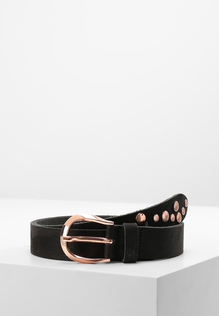 Ceinture en daim noir avec boucle en or rose et clous décoratifs en or rose à une extrémité, présentée enroulée sur une surface blanche.