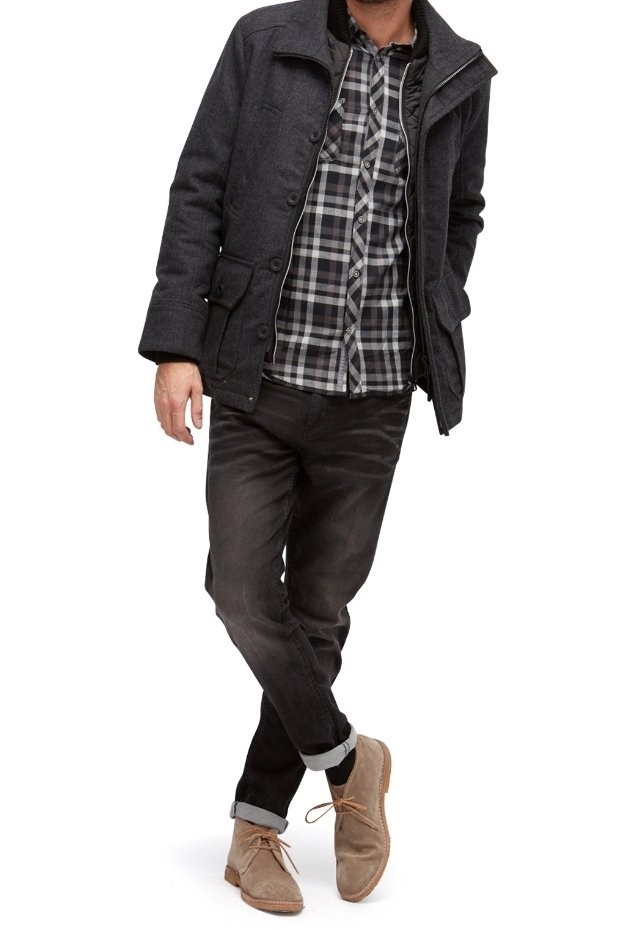 Homme portant une veste gris foncé, une chemise à carreaux noir et blanc, un jean noir retroussé et des chaussures en daim couleur fauve, debout en tailleur.