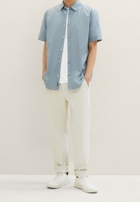Homme portant une chemise à manches courtes bleu clair et un pantalon blanc, debout devant un fond beige uni.