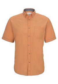 Chemise orange à manches courtes, boutonnée sur le devant, avec poche poitrine et col boutonné, présentée sur fond blanc.
