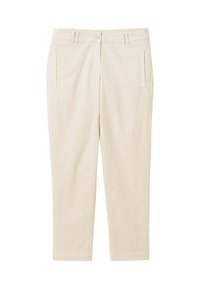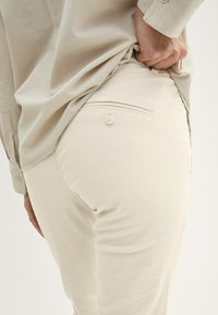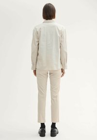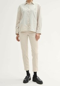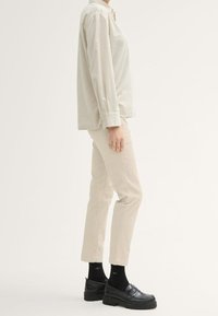 Personne portant un pantalon beige, une chemise à manches longues beige clair avec boutons, des chaussettes noires et des mocassins noirs épais, debout sur un fond blanc.