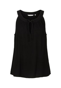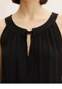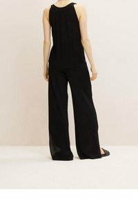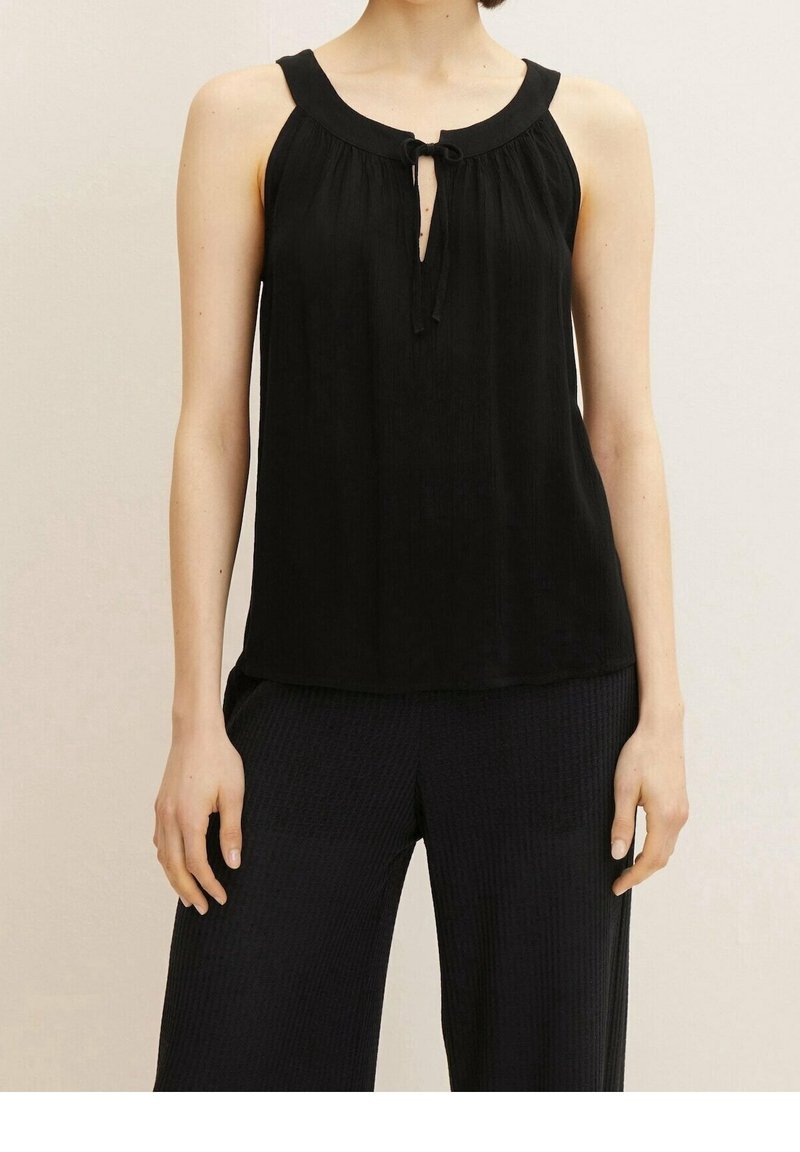 Femme portant un haut noir sans manches avec un col en trou de serrure noué et un pantalon large noir texturé, debout devant un fond neutre.