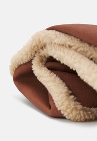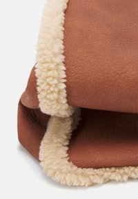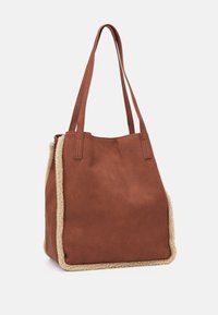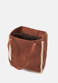 Sac fourre-tout marron avec longues anses, matériau à texture douce, et bordure en polaire beige le long des côtés et des bords inférieurs.