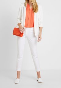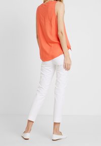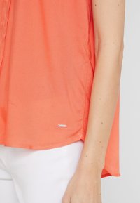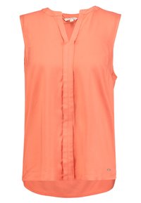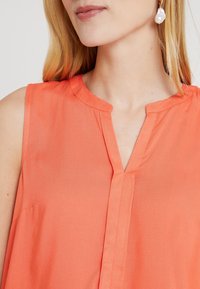 Blouse sans manches corail avec un col montant, en tissu léger, à coupe décontractée et avec une patte de boutonnage sur le devant, assortie avec un pantalon blanc.